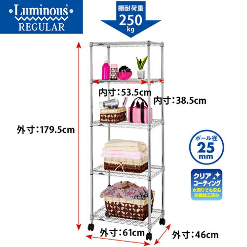 商品シリーズ ルミナスレギュラー(Luminous Regular) 型番 NLH6018-5 アイテムカテゴリ フリーラック/ホームラック サイズモデル ポール径 25mm/幅60 奥行45モデル/5段 外形寸法 アジャスタ装着時:(約)幅61×奥行46×高さ174cmキャスター装着時:(約)幅61×奥行46×高さ179.5cm 棚板 有効内寸 53.5×38.5cm 耐荷重(全体) 500kg 耐荷重(棚板1枚) 250kg 塗装・コーティング クロームメッキ:クリアコーティング(防錆加工) 素材 シェルフ(棚)・ポール:スチール(クロームメッキ)、スリーブ:ABS樹脂 ポール分割 3分割タイプ [上部ポール](約)53.3cm [中間ポール](約)59.7cm [下部ポール](約)58.9cm ポールの溝の数 66本 セット内容 棚板×5、ポール×4、標準アジャスター×4、ナイロンキャスター×4(ロック付×2、ロックなし×2)、スリーブ(取付部品)21組、スパナ×1 梱包サイズ・重量 (約)50×92×50cm/41.3kg JANコード 4548934252080 アジャスタの仕様 標準アジャスター キャスターの仕様 取り付け時高さ:高さ6.8cm/材質:ナイロン樹脂、スチール(亜鉛メッキ) 増設可能パーツ SHL-6045SL2 SR6045 SM-6045 PS6045-IV PS6045-RE PS6045-SV PS6045-NV WS6045-NA WS6045-BR SM6045-M SW6045 SL6045-S SR6045-S THL-4525SL2 SS4525-H SS6025-H KWB-6045S 25KWB6045 WBL-045SL WBL-060SL おすすめ用途・使用例 サビに強く、高耐荷重!さらにカスタムパーツが豊富なルミナスなら様々なシーンで活躍します! ★