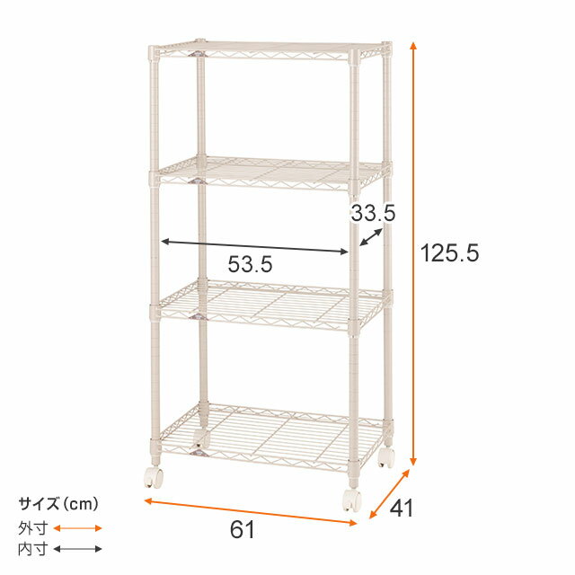 サイズ キャスター取付時:幅61×奥行41×高さ125.5cm アジャスター取付時:幅61×奥行41×高さ121cm ワイヤーシェルフサイズ:(約)幅61×奥行41cm(内寸:幅53.5×奥行33.5cm) 耐荷重 ラック全体耐荷重 アジャスター使用時:320kg キャスター静止時:300kg キャスター走行時:50kg シェルフ1枚耐荷重:80kg 型番 RC6012-4 商品シリーズ 25mm/Luminous Riche ルミナス リシェ アイテムカテゴリ 組み立て式 スチールラック 材質 本体:スチール コーティング/塗装 粉体塗装 (エポキシポリエステル樹脂塗装) ハンマートーン加工 セット内容 シェルフ(棚板)×4、ポール×4、スリーブ(取付部品)、標準アジャスター(固定足パーツ)×4、ストッパー付キャスター×4、ストッパー無しキャスター×4、スパナ×1、取扱説明書 JANコード 4550283513798 備考 柔かなカラーと質感、ナチュラルな木の優しさ 北欧インテリアやナチュラルな雰囲気のお部屋にピッタリのLuminous Riche(ルミナス リシェ)シリーズです。