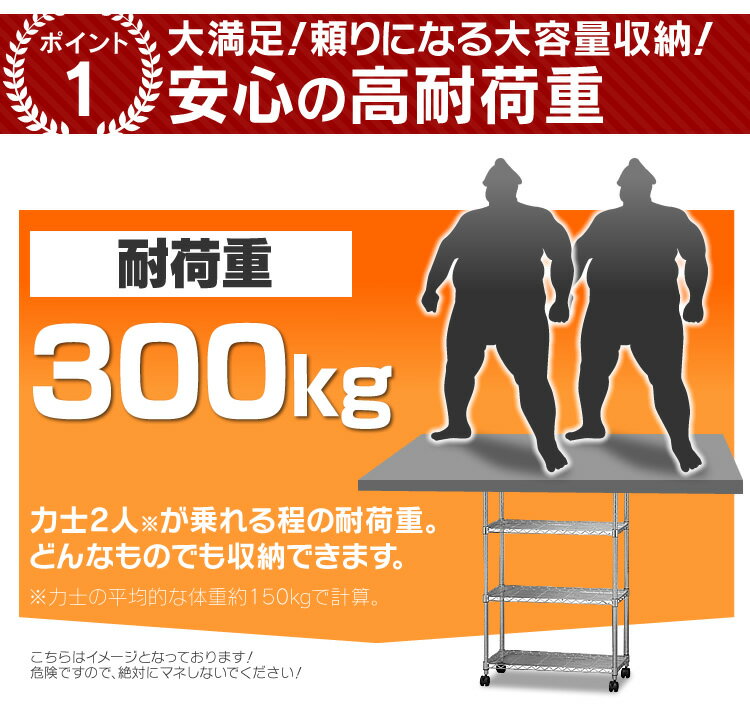 耐荷重は、棚板1枚当たり100kg、全体(キャスター使用静止時)で300kgです。