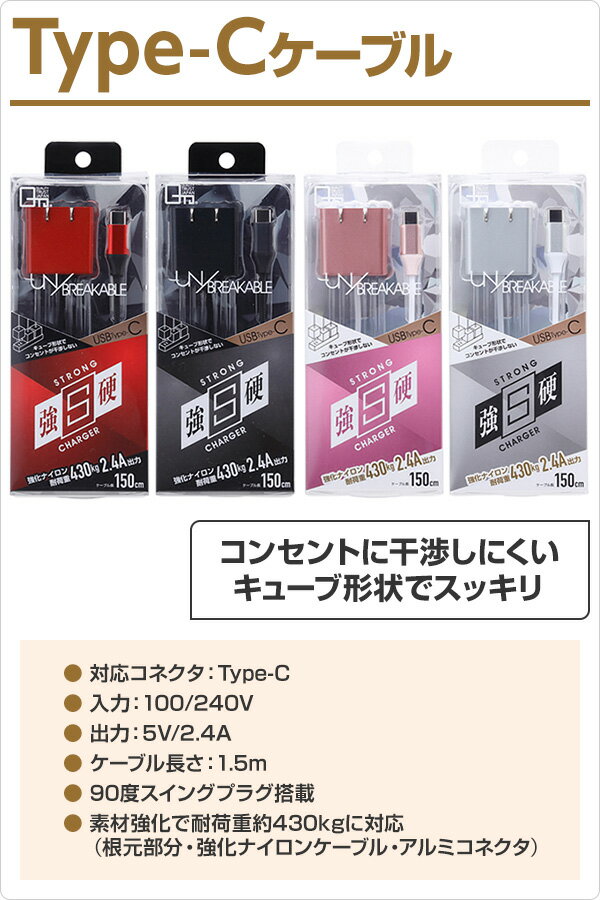 QTJ(クオリティトラストジャパン) AC充電器 Type-Cケーブル一体型(最大出力2.4A) 1.5m 強化ナイロンケーブル QTC-022 本体サイズ 幅1.5×奥行2.5×高さ154.5cm 重量60g 商品説明 ●対応コネクタ:Type-C●入力:100/240V●出力:5V/2.4A●ケーブル長さ:1.5m●90度スイングプラグ搭載●素材強化で耐荷重約430kgに対応(根元部分・強化ナイロンケーブル・アルミコネクタ)●コンセントに干渉しにくいキューブ形状でスッキリ●4色から選べるカラーバリエーション 商品補足説明 YAMAZEN ヤマゼン 山善 通販 充電器 充電機 充電 通信 ケーブル コネクタ スマホ充電 タブレット充電 USB充電 ライトニング Apple iPhone アイフォン 充電器 AC バッテリー 50107 50108 50109 50110生活家電 ランキング