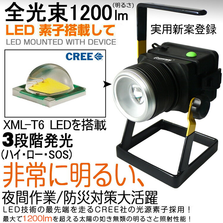 この投光器では、ズーム機能(光拡散範囲調整構造)を設けることにより簡単に光の範囲を調整可能!! ●全光束最大1200LM!ハイパワーと小型化の組み合せ! 世界が認めた最強級米国「CREE」社LED光源素子を搭載、全光束1200LMを実現!超拡散な明るさを誇る!夜間作業しても明るさは抜群! ●ハンドル付き&床スタンド付き 超軽量・コンパクト ハンドル付で、持ち運びラクラク!! ハンドルの角度調整も可能!! 手持ち、床置き、スタンド、吊り下げ等様々なシーンで使用可能! お好きな場所に簡単設置!! ●操作簡単!シーンに合わせて照射モードを3段階(ハイ・ロー・SOS)で切り替え可能。
