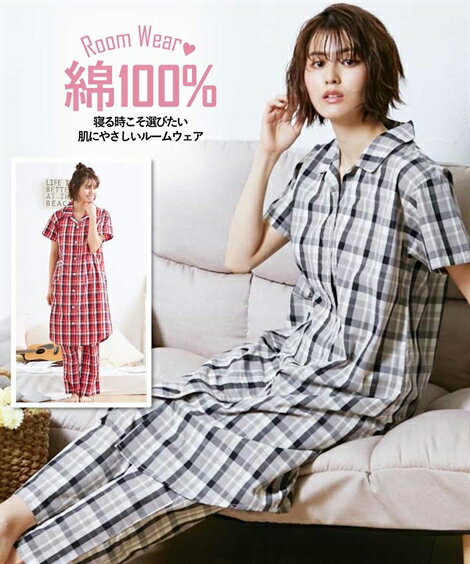 パジャマ 上下セット 大きいサイズ レディース 綿100% チェック ゆったり 半袖 シャツ ワンピ+ボトムセット ネイビー×赤系/モノトーン系 8L/10L ニッセン